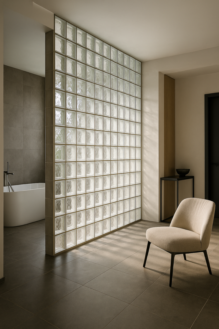 Szklany moduł daje efekt, którego trudno szukać w klasycznych przegrodach: gra refleksów, subtelny połysk, czytelny rytm spoin. W wysokim standardzie liczy się detal – luksfery mogą stać się „biżuterią” wnętrza, zwłaszcza przy dobrze zaprojektowanym oświetleniu nocnym (washery, linie LED, kinkiety).